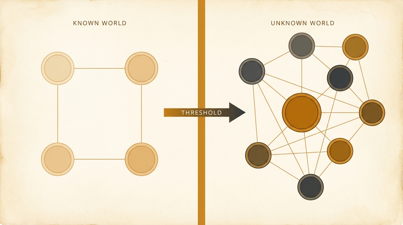 Crossing the threshold. The known world on the left is orderly and sparse. The unknown world on the right is denser and more interconnected. Once the hero crosses, the structure of the story changes.
