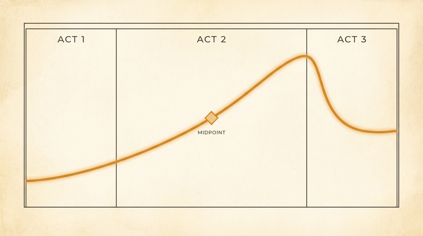 Three-act structure with tension curve. Act 1 sets up the world, Act 2 builds through the midpoint to maximum tension, Act 3 resolves it.