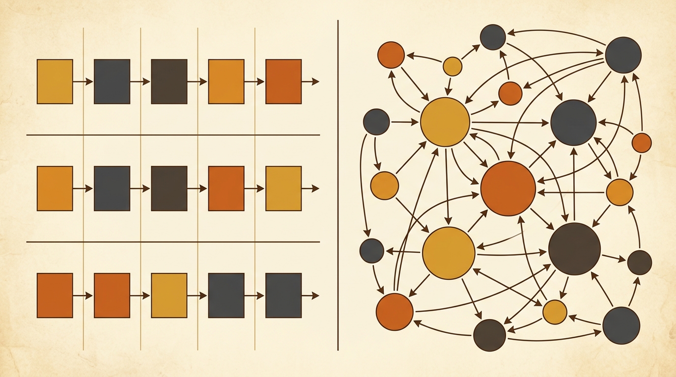 Left: timeline-based outlining (rows and columns). Right: map-based outlining (nodes and connections).