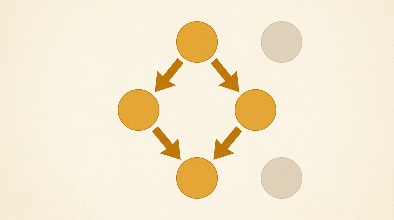 Directional edges between nodes show which events cause or enable others. The isolated node with no connections is a dangling plot thread, made visible by the structure itself.